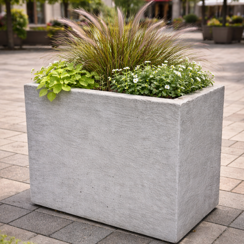 Tento moderní betonový květináč je ideální pro výsadbu okrasných travin, keřů, trvalek nebo menších dřevin. Pevná konstrukce a vysoká hmotnost vláknobetonu zajišťují vynikající stabilitu i na frekventovaných místech, což ocení zejména města, developeři, hotely či administrativní budovy.