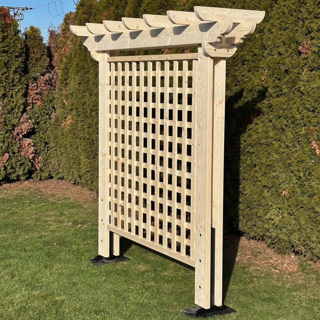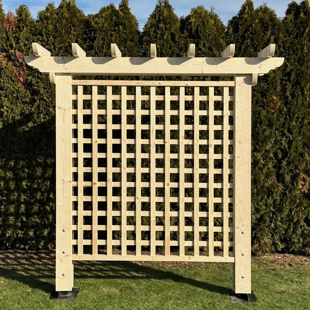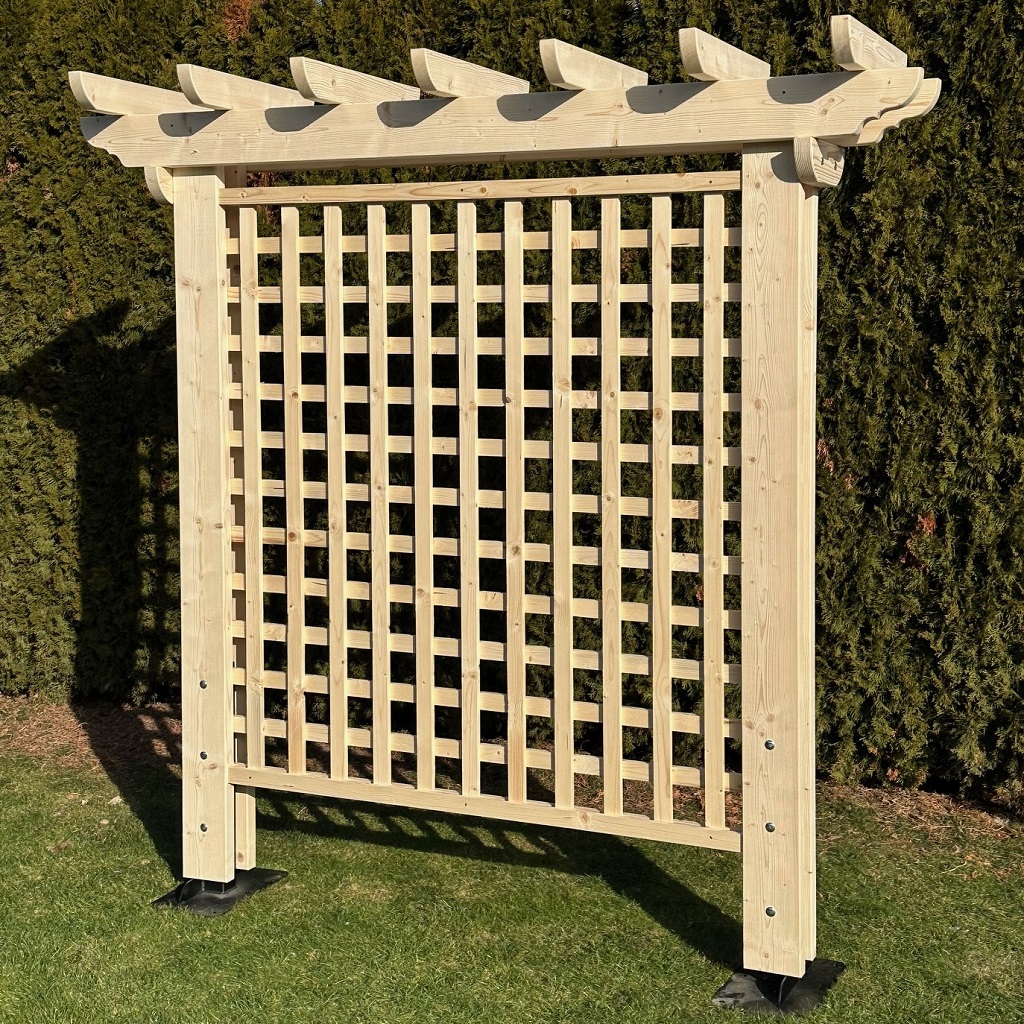Masívna drevená pergola s mriežkou (trelážou) je kvalitným a funkčným riešením pre záhradu, ktoré spája prirodzený vzhľad dreva s pevnou konštrukciou. Je ideálna ako opora pre popínavé rastliny, dekoratívny prvok alebo ako praktické oddelenie záhradného priestoru.